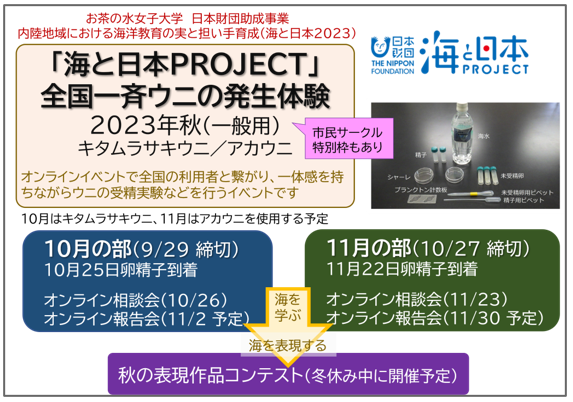 お茶の水女子大学湾岸生物教育研究所は、2023年10月11日~2024年1月に、全国各地の学校へのウニ教材提供と、ご家庭や市民サークル等で本格的な発生実験を行う体験活動を融合させたイベント「全国一斉ウニの発生体験2023年秋」を開催いたします。