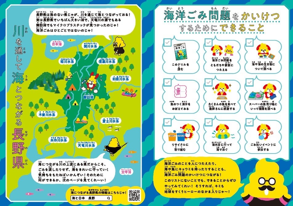 海洋ごみ学習をより低学年から学んでもらおうとわかりやすく興味をもってもらいやすい内容とするため、児童に人気のうんこドリルとのコラボレーションを企画しました。教材はクイズ形式となっていて、海のごみで苦しんでいる生き物や人を探してみようという内容や目に見えないマイクロプラスチックによる悪い影響などについて、かわいらしいイラストで紹介しています。また、巻末には、川を通して海とつながる長野県を地図上で表記。また、海洋ごみ問題を解決するためにできることを各児童に取り組んでもらおうとチェック欄を設けてイラスト化しています。