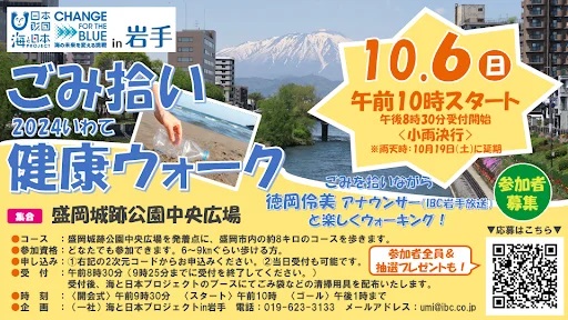 一般社団法人海と日本プロジェクト in 岩手は、岩手県・盛岡市・岩手日報社に協力し、2024年10月6日(日)に、ごみ拾いをしながらウォーキングをする「2024いわて健康ウォーク」を開催いたします。