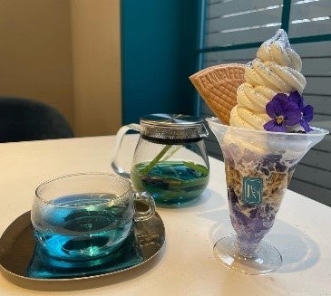 ブルーのティー。レモン果汁を加えると変化する色や香りが楽しめます。