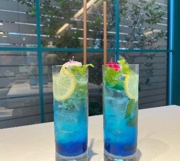 ビル内SustainuS farmで摘みたてのハーブ類とバタフライピーの爽やかな