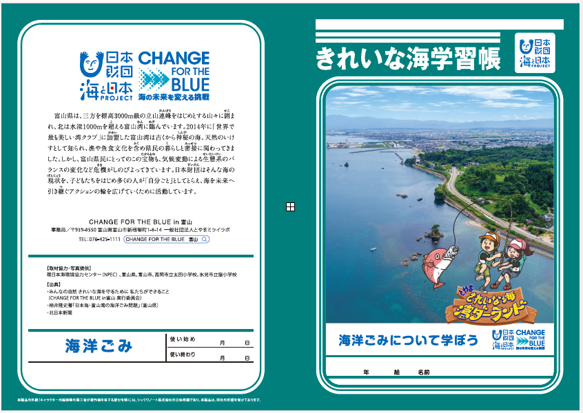 「CHANGE FOR THE BLUE in富山」を進める一般社団法人とやまミライラボは、7月17日(水)、「きれいな海学習帳」の贈呈式を実施いたします。本学習帳は、子どもたちが「海のごみはどこからくるのか」や「美しい富山湾を守るために自分たちに何ができるのか」などを知り、海洋ごみ問題について学びを深めてもらうことを目的としています。本学習帳は、夏休み前に県内の小学校4年生全員に配布いたします。