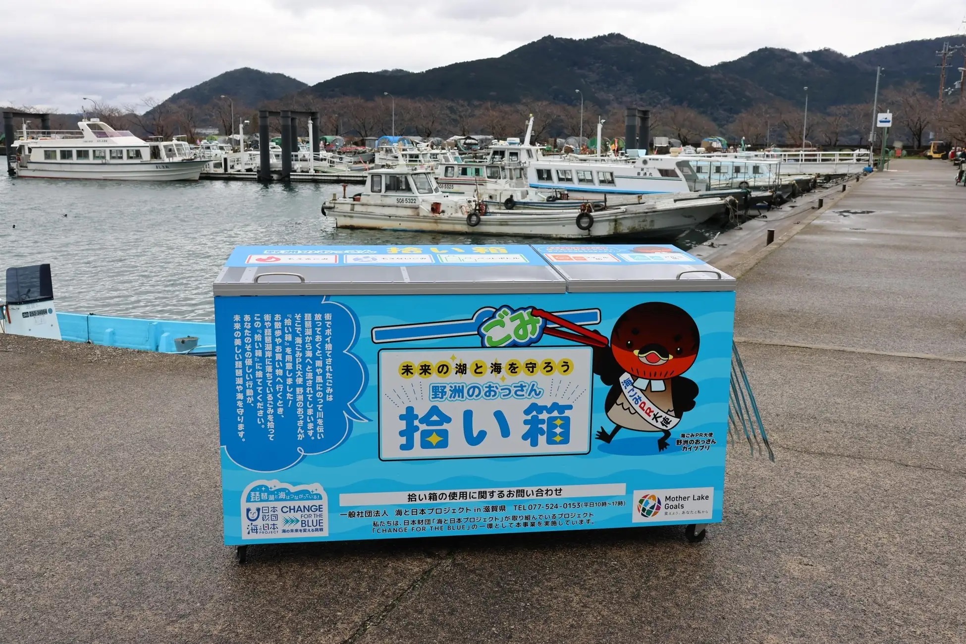 拾い箱には「海ごみPR大使」として活動している、滋賀の県鳥カイツブリのキャラクター「野洲のおっさん」のイラスト、海洋プラスチックごみ問題についてや清掃活動へのメッセージがデザインされています。高さ95cm、幅180cmのケースの中には、4種類のごみを分別して収納できるようになっています。滋賀県内では、高島市や彦根市、近江八幡市で既に活用されています。