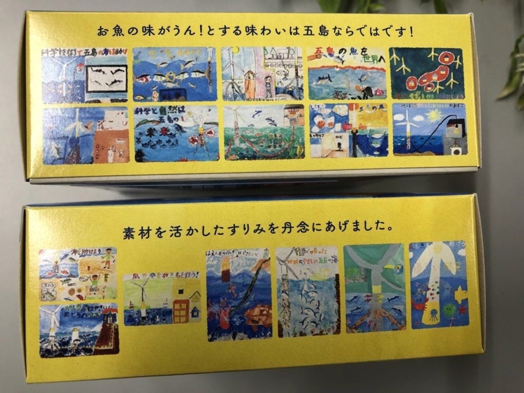 子どもたちは2泊3日の体験を通し、磯焼け(海水温の上昇などの海洋環境の変化により海藻が生息する「藻場(もば)」が減少・消失している現象)が深刻になっていること、海風が電力を生み出していること、浮体式洋上風力発電が魚の棲家にもなっていること、その電力が島の特産品を作っていることなど、海のつながりを学び、考え、最後のまとめとして伝えたいことを絵で表現しました。子どもたちの海への思いか詰まった絵をパッケージにして全国に届けようと作られた商品が、今回水産庁長官賞を受賞した「しまおうのかまぼこ」なんです!