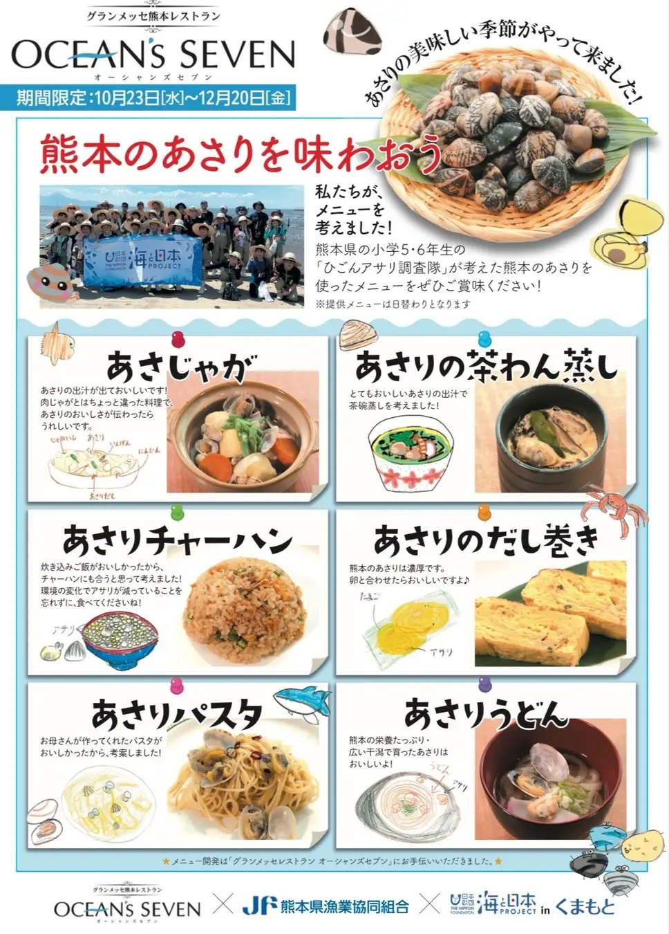 一般社団法人くまもと海のミライは、グランメッセレストラン オーシャンズセブンと熊本県漁業協同組合連合会の協力のもと2024年10月23日(水)~12月20日(金)に「ひごんアサリ調査隊」の小学生が考案した熊本県産あさりを使用した料理を提供いたします。