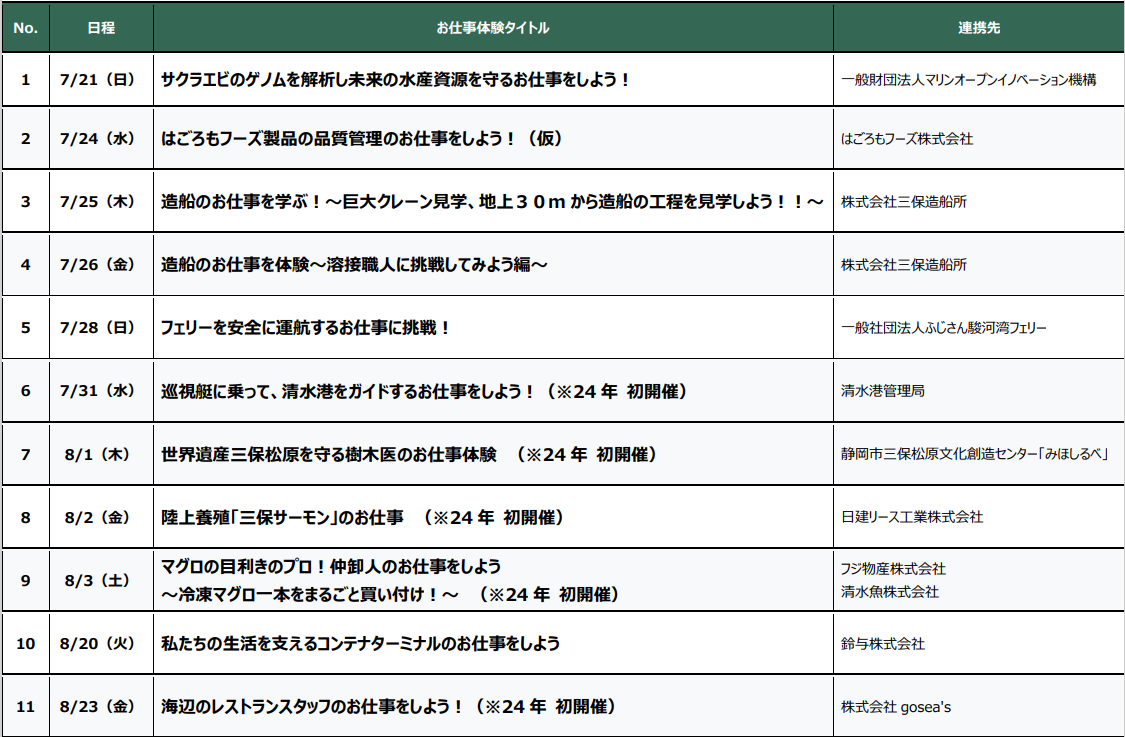 「こどもわーくin清水港」は2023年にスタートし、人々の生活を支える海の玄関口「清水港」をテーマに、清水港を拠点とする企業・団体の皆さまと協力しながら、物流・造船・水産加工・研究、旅客船などの様々なプログラムを展開して参りました。2024年では、昨年プログラムのリニューアルに加え、更に体験できる職種を追加し、陸上養殖や海辺のレストランをはじめ、マグロの仲卸・樹木医など、全11種のお仕事体験をご用意いたしました。
