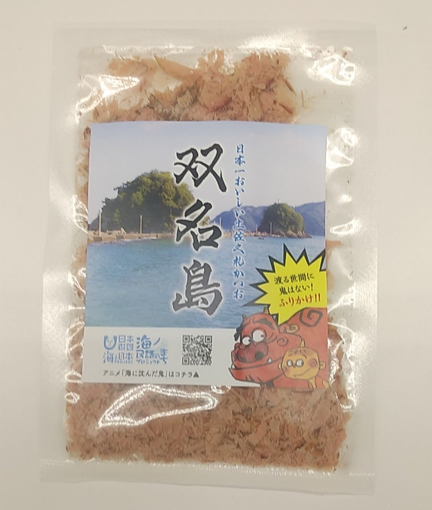 鰹節のふりかけ!パッケージには双名島の写真と心優しい鬼の親子のコラージュ