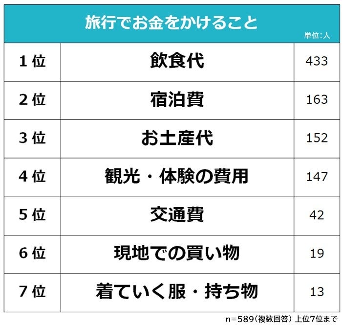 また、4位に「観光・体験の費用(147人)」がランクインするなど、昨今では旅先で新たな知識の獲得・意識の醸成に繋がるような体験を重視する傾向も見られます。