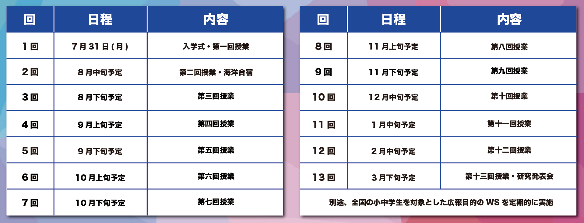 日本の第一線で活躍している3Dの専門家である吉本大輝が主任講師となり、中学生と、全13回の授業で一人一つの海洋生物について徹底的に研究、3Dデータを活用して成果の発表を行う体験型教育プロジェクトです。研究生にはそれぞれ「3Dプリンター」と「3Dデータを扱うための高性能PC」「最新ペンタブレット」を無料で支給し、オンラインと対面の実習授業を行います。受講料は完全無料です。