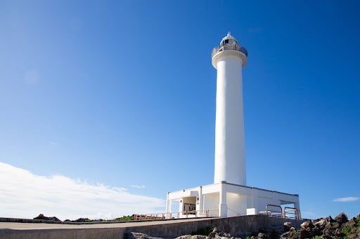 沖縄本島、東シナ海に面する残波岬の突端に立つ灯台。終戦後、米軍の実弾練習場だった場所に建てられ、日本返還後に初点灯しました。灯台周辺は現在、沖縄海岸国定公園に指定され、沖縄本島有数のスポットとなっています。