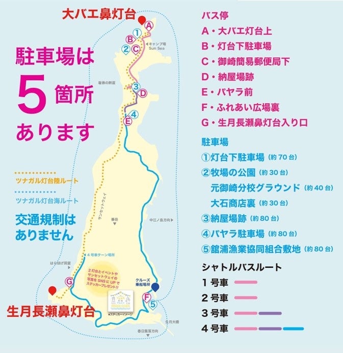 駐車場は島内5か所の駐車場よりシャトルバスでお越しください。 |