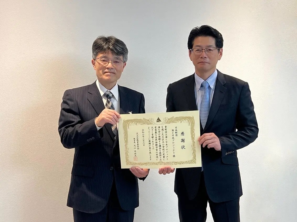 本取り組みは次世代へ豊かで美しい海を引き継ぐために、海を介して人と人とがつながる“日本財団「海と日本プロジェクト」”の一環として行っており、2024年3月6日、足立区教育長(大山 日出夫氏)が日本財団を往訪し、日本財団「海と日本プロジェクト」の実行責任者 である海野光行氏(公益財団法人 日本財団 常務理事)に対して感謝状を贈呈されました。