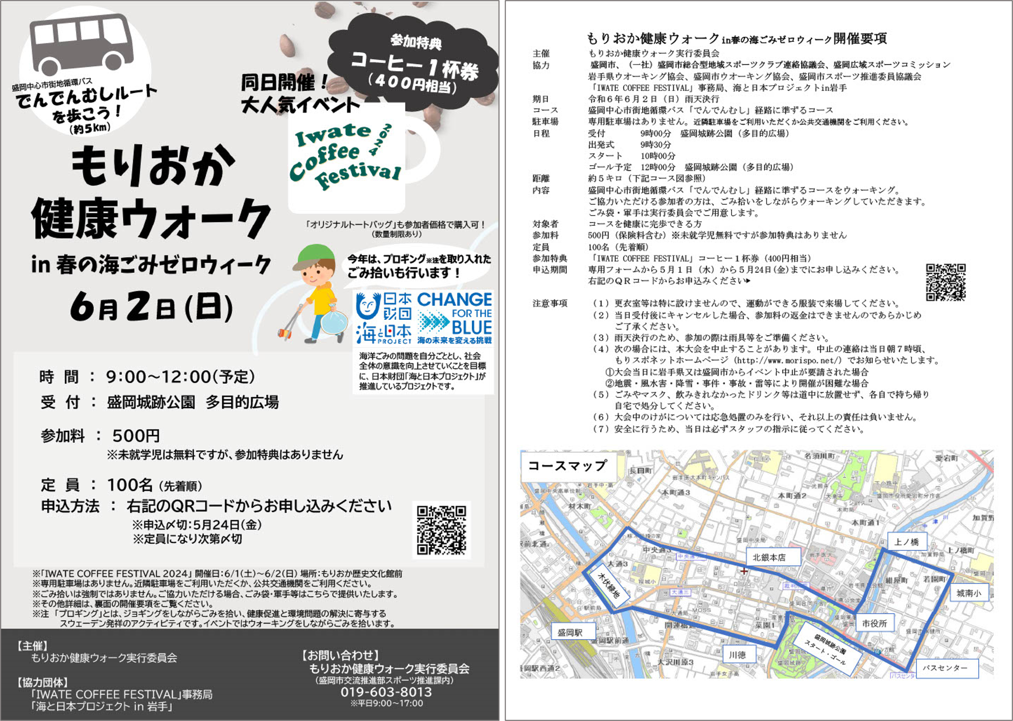 コースは盛岡中心街地循環バス「でんでんむし」のルート約5kmです。参加者には、同日もりおか歴史文化館前広場にて開催している「IWATE COFFEE FESTIVAL 2024」で使えるコーヒー1杯券(400円相当)をお配りします。また、IBC岩手放送の神山浩樹アナウンサーもごみ拾いに参加いたします。