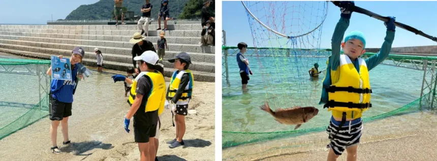 続いてのプログラムは、地元の水産資源のつかみ取り体験。体験が始まる前に、つかみ取りを通して学ぶ魚種の特徴について学びます。今回準備したのは、地元で養殖されているマダイ、シマアジ、スズキや天然魚のマアジ、ケンサキイカ、メジナなど約10種類。参加者はライフジャケットを着用し、実際の海の中に設置された特設のいけすの中で大きな網を使って魚を捕えました。中には、1キロを超えるサイズのマダイやシマアジもおり、魚が泳ぐ迫力やとげの鋭さなどを間近に観察することが出来ました。
