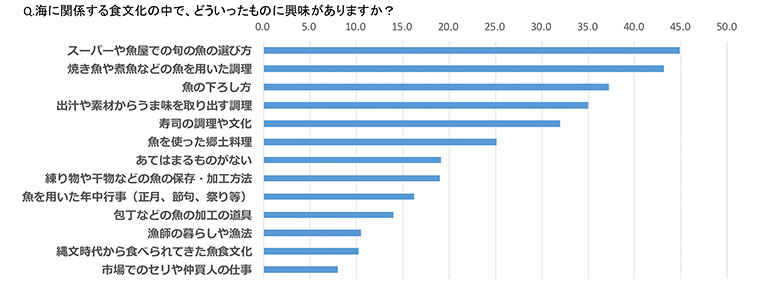 海に関係する食文化の中で興味のあることは、「魚の選び方」や「調理方法」といった料理に直接関係することに関心が高い反面、漁師や市場、道具といった背景や関連情報への関心は低いことがわかりました。
