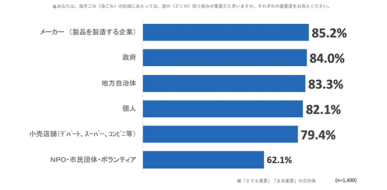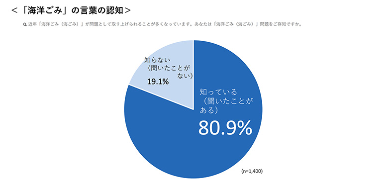 調査の結果、約8割の人が「海洋ごみ」という言葉を認知していて、60代以上では9割を超えています。また、海洋ごみの削減についても、個人から企業、政府に至るまで、誰もが取り組むべき重要な課題だと認識されている結果になりました。