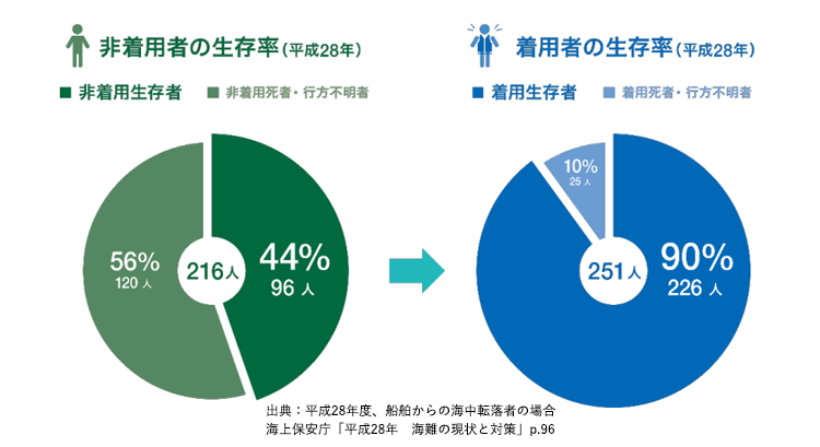 船舶から転落した場合、ライフジャケット着用者の生存率は9割、